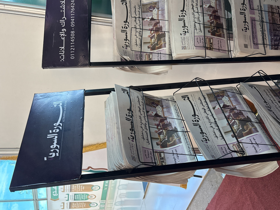 The scene is situated indoors, in Al-Ghizlaniya, Syria. Two black metal multi-tiered newspaper display racks are prominently positioned. The left rack features a top signboard displaying "الثورة السورية" (Al-Thawra Al-Suriyya) with the English transliteration "ALTHAWRA ALSUYRIYA." The right rack's signboard provides contact information for subscriptions and advertisements: "للاشتراك والإعلانات: 0112114508 - 0941176424." Both racks are fully stocked with multiple copies of "الثورة السورية" newspaper. The visible front pages uniformly feature a color photograph depicting several men in formal attire seated around a table during what appears to be a meeting, with a flag visible in the background. Arabic headlines on the newspaper include "المجلس الوطني الكردي" (The Kurdish National Council) "في دمشق" (in Damascus) and "إحياء النشاط السياسي وآفاق المستقبل" (reviving political activity and future prospects), along with text mentioning "NASTEX" and "ماذا تعني استعادة مطار القامشلي" (What does the restoration of Qamishli Airport mean?). The environment consists of a light-colored wall in the background. A red carpet is visible on the floor in the left foreground. To the left and rear, a pleated light-colored fabric and a green and white banner with circular graphics and Arabic text are partially discernible. No individuals are present in the frame.