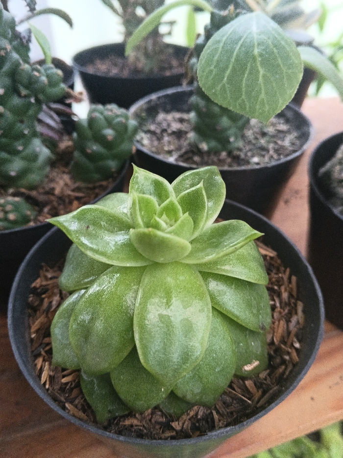 The image displays a close-up of multiple potted plants, located in Munyati, Zimbabwe. In the foreground, a vibrant green succulent plant, characterized by a rosette formation of fleshy, glossy leaves, is centered within a black plastic pot. The plant's leaves appear slightly damp. The pot's soil is dark, mixed with light brown wood chips. This pot rests on a reddish-brown wooden surface. In the blurred background, several other plants in black plastic pots are visible, including one on the left with segmented, knobby green stems, and another toward the right exhibiting a distinct, fuzzy, oval green leaf. No individuals or specific actions are depicted; the scene is static and well-lit by ambient light.