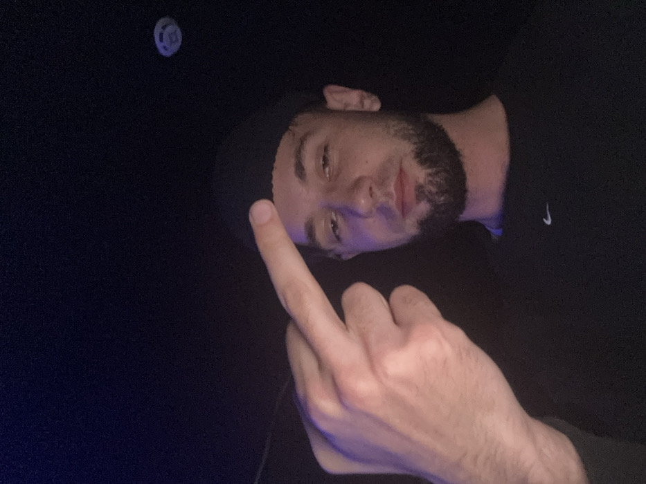 A sideways close-up shows a man with a dark beanie and beard giving the middle finger. He has fair skin and is wearing a dark shirt with a small white Nike swoosh on the right shoulder. The background is very dark, and there is a faint circular object with a design in the top left corner. The man's expression is somewhat neutral as he looks directly at the viewer.