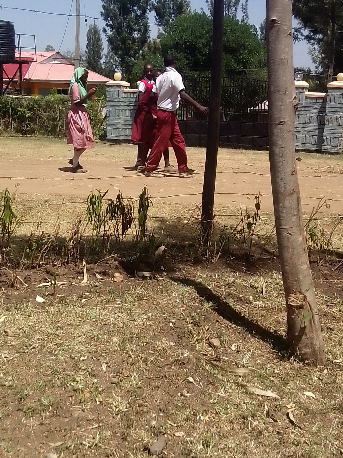 The image depicts an outdoor, sunlit scene within the city of Unknown, Unknown, likely a residential area or school grounds, captured from a slightly elevated perspective. In the foreground, the ground is covered with dry, sparse grass and patches of exposed brown dirt, with some minimal green shoots. To the right, a dark brown utility pole stands vertically, and immediately to its right, a lighter-colored tree trunk is visible. Long shadows are cast from these vertical elements towards the lower left, indicating a bright daylight setting. In the mid-ground, a wide dirt path or unpaved road extends across the scene. Three individuals, appearing to be school-aged, are situated on this path. On the left, a female, dressed in a long pink dress, white socks, and dark shoes, wears a light green head covering. She holds a small, dark rectangular object in her hands at waist level and is facing towards the other two individuals. The two central figures walk or stand in close proximity. One individual, wearing a white short-sleeved shirt, red trousers, and light-colored shoes, is positioned on the right of this pair, with their left arm slightly extended. Adjacent to and partially obscured behind this person is another individual, wearing a red pinafore or dress over a white top and dark shoes. In the background, a low wall constructed of light-colored blocks or stone with decorative caps on pillars spans the scene. A black metal gate is integrated into this wall. Behind the wall and gate, dense green foliage from trees is prominent. To the far left background, a building with a pink-tiled roof and light-colored walls is partially visible, with a black water tank elevated on a red metal stand situated next to it. The sky above is clear and blue.