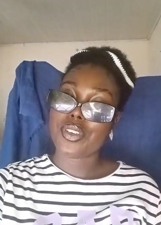 young woman with dark skin, wearing a black-and-white striped shirt, black sunglasses, and a white headband. She has her hair up in a bun and is wearing lip gloss. Behind her is a blue cloth draped over something. She seems to be looking at the camera and moving her head slightly to the music. A silver bracelet is visible on her left wrist. The ceiling is white and there is a light bulb hanging from it.
