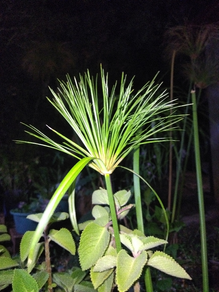 This image depicts a nighttime outdoor scene in Tinaquillo, Venezuela, illuminated by an artificial light source. The central subject is a Cyperus alternifolius (umbrella plant) with bright green, thin leaves radiating horizontally from a central point at the top of a green stem. One prominent leaf extends downwards and to the left. Below and partially behind the umbrella plant, Plectranthus amboinicus (Cuban oregano) plants are visible, displaying broader, textured, light green leaves. In the dark background to the right, several tall, thin, vertical stalks of additional plants, consistent with more Cyperus alternifolius, are faintly discernible. A dark blue or green container is partially visible in the mid-ground on the left. No individuals or specific actions are observed.