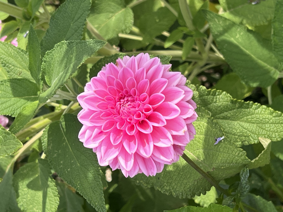 A close-up photograph depicts a single, fully bloomed dahlia flower, prominent in the frame and centered, in a garden setting within Giverny, France. The flower is vibrant fuchsia-pink, exhibiting a spherical or pompom-like form composed of numerous tightly packed, overlapping petals. The petals near the center are a deeper pink, gradually lightening towards the edges of the outer petals. Surrounding the dahlia are various green leaves and stems, creating a dense background and foreground, some appearing textured with serrated edges. Natural daylight illuminates the scene, casting subtle shadows and highlighting the flower's surface. A small, pale purple fragment rests on a large green leaf positioned below and to the left of the dahlia. No individuals are present in the image.