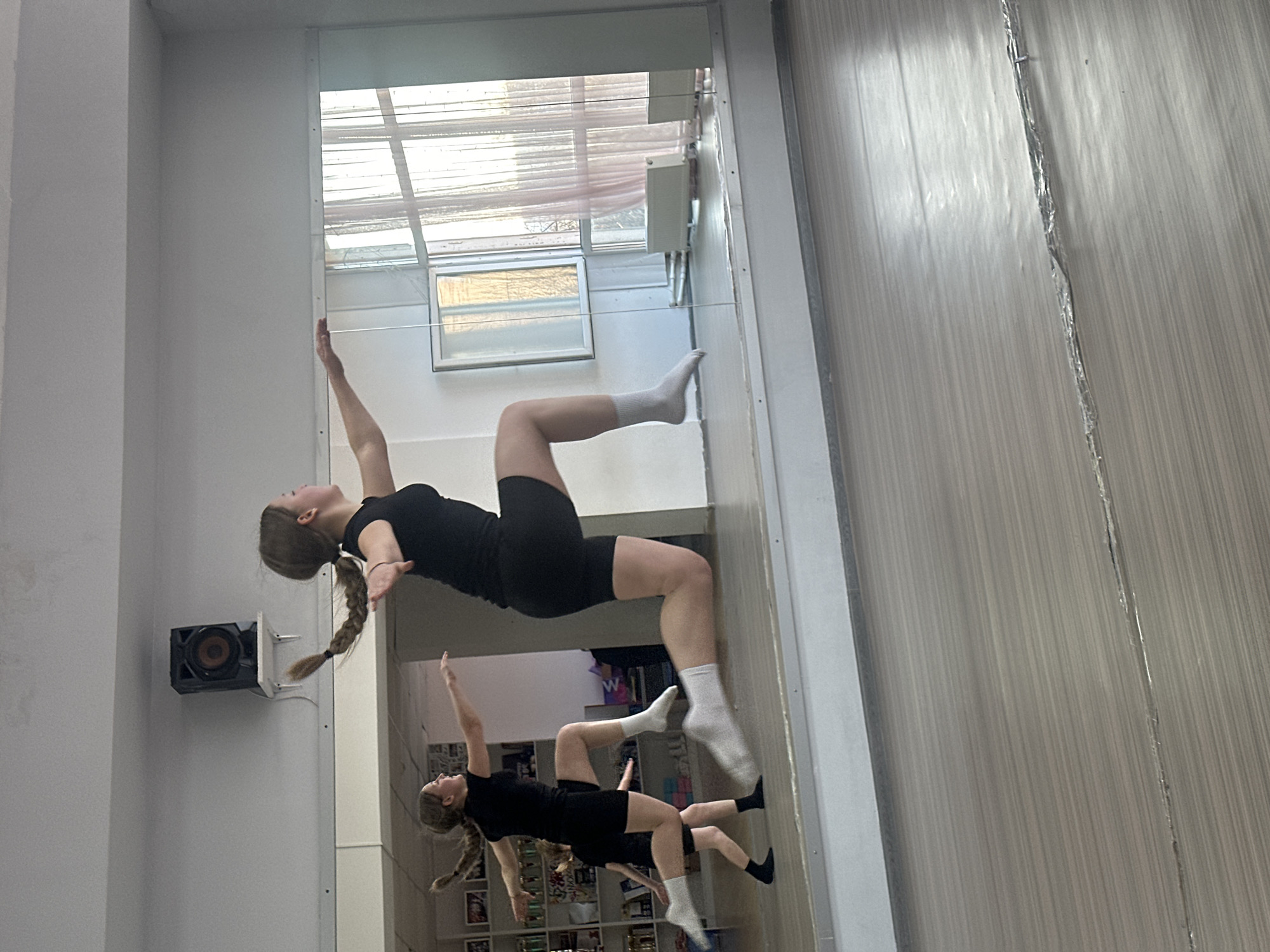 The image displays an indoor scene within a dance or gymnastic studio, located in Votkinsk, Russia. A young female subject is depicted in mid-air, executing a dynamic leap. She has light brown hair styled in a single braid, which is airborne due to her movement. She is dressed in a black short-sleeved top, black athletic shorts, and white ankle socks. Her left leg is bent with the thigh horizontal, while her right leg is extended backward and slightly downward. Both arms are extended horizontally to her sides. A large mirror wall occupies the background from the center to the right, prominently reflecting the subject in an identical pose, appearing smaller and further back. Behind the reflected subject, a section of wall with shelves holding various items, possibly trophies or decorative objects, is visible. Above the mirror, on the upper left, a dark rectangular speaker is mounted on a white shelf against a plain light-colored wall. The mirror also reflects a large window on the right side, featuring white frames and light-colored sheer curtains, indicating an external light source. Below the reflected window, two white radiators are present. The floor is a light brown, wood-grain patterned surface. A distinct, irregular seam or crack, covered with a reflective, metallic-like material, runs horizontally across the lower portion of the floor. The ceiling is a plain, light-colored surface with minor smudges or discoloration.