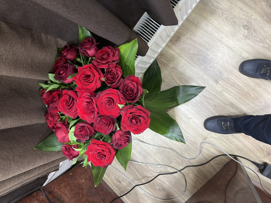 The image depicts an indoor scene, observed from an overhead perspective. A large, vibrant bouquet of red roses with abundant green foliage is centrally positioned. Directly beneath the bouquet, the lower legs and feet of an individual are visible, wearing dark blue trousers and dark blue loafer-style shoes, each featuring a metallic buckle on the vamp. The individual's feet are spaced apart, with the bouquet situated between them and slightly forward. The flooring is light-colored laminate with a visible wood grain pattern. In the background, dark brown, heavily pleated curtains are drawn, with a white, finned radiator partially visible beneath them on the right side of the frame. To the left, a section of dark wooden furniture or paneling is present, accompanied by black and grey electrical cables haphazardly arranged on the floor, one connected to a black power adapter. While specific visual identifiers for Namangan City, Uzbekistan, are not discernible in the image, the scene is contextually described as occurring within that city.