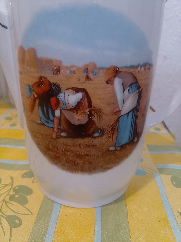 A white ceramic mug, with a glossy finish, stands on a yellow and light blue striped tablecloth adorned with light green olive-like motifs. The mug features a printed illustration depicting a rural agricultural scene, not a city location. The foreground of the illustration shows three women engaged in gleaning in a harvested field. The woman on the left is bent over, wearing a blue dress or skirt with a dark red or brown top and head covering. In the center, a woman kneels, gathering bundles of grain, dressed in a white bonnet, light blue top, and dark brown skirt. To her right, another woman bends forward, also collecting stalks, wearing a white apron over a light blue skirt and a brown top with a light brown head covering. All three appear to be gathering fallen or leftover stalks from the field. The ground is depicted as dry, yellowish-brown stubble. In the mid-ground and background, additional indistinct figures are visible performing similar tasks, along with what appear to be haystacks or bundled crops. The horizon features a distant treeline under a light blue sky.