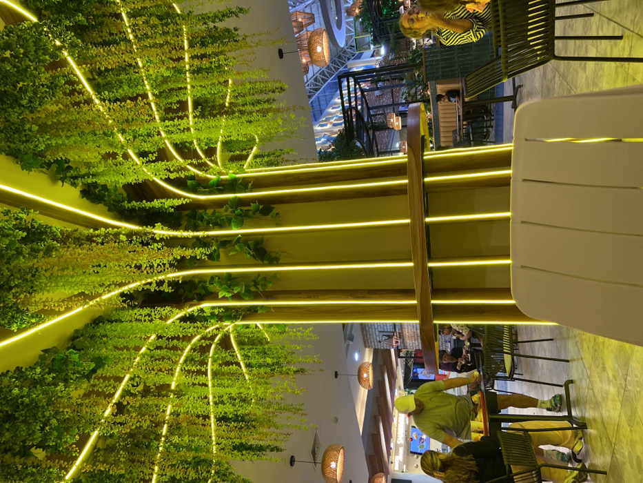 An indoor space features abundant greenery cascading from the ceiling, highlighted by linear yellow lights. Tables and chairs are scattered throughout, some occupied by people. A white structure occupies a portion of the foreground. In the background, decorative hanging lights are visible, as well as elements of the building's interior structure.