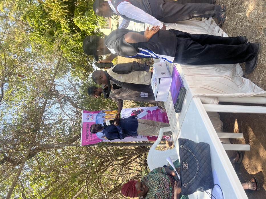 The scene depicts an outdoor event in Bukuru, Nigeria, under partial tree canopy on dry, unpaved ground