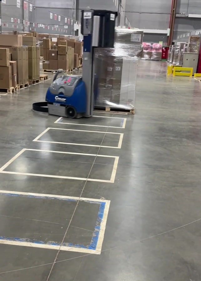 large warehouse interior, focusing on a blue automated guided vehicle (AGV) moving a pallet of wrapped boxes
