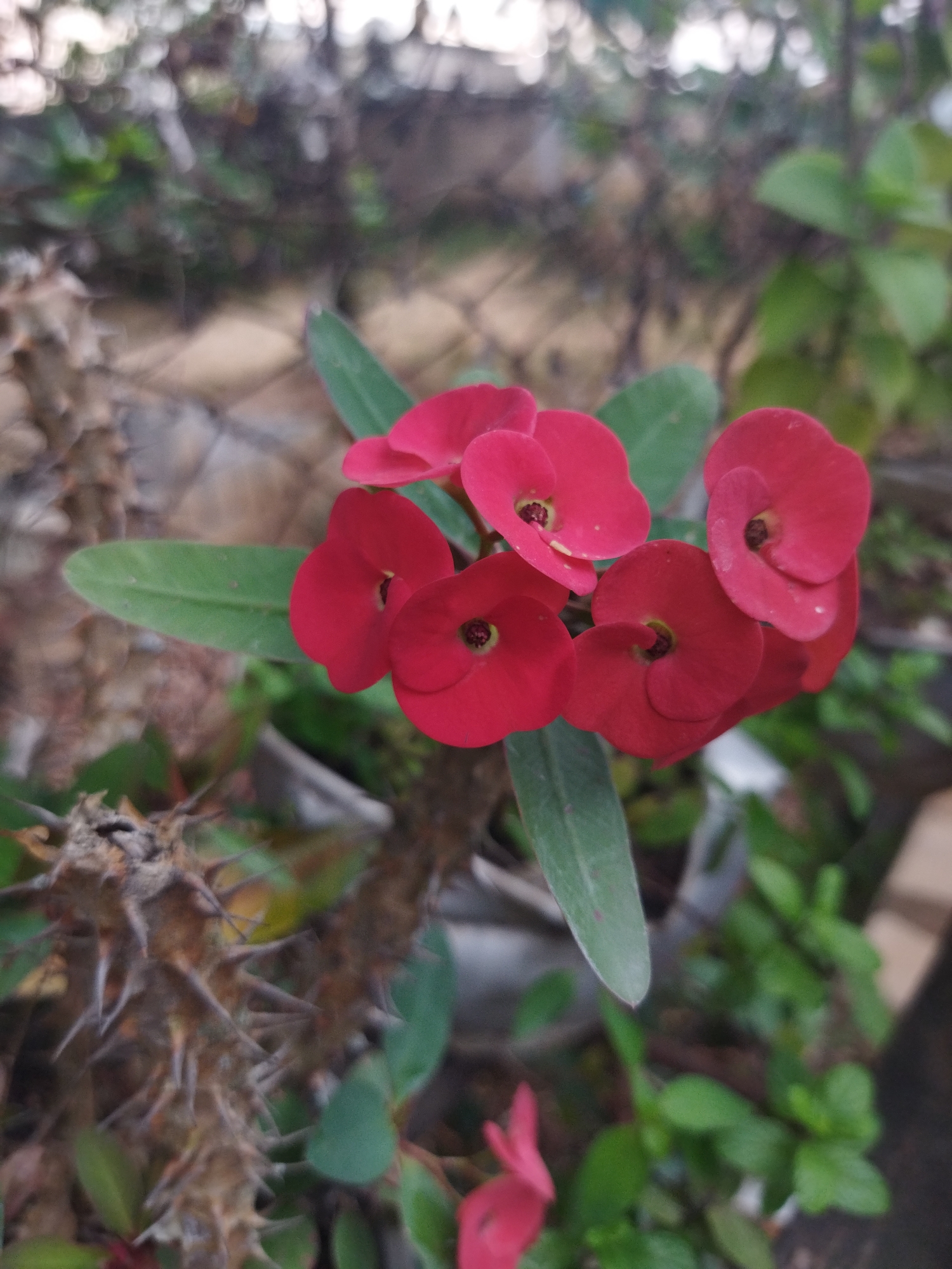 close-up of a cluster of red Crown of Thorns flowers (Euphorbia milii) with green leaves, growing on a thorny stem. The background is blurred, showing other greenery and what appears to be a fence. The location is Tinaquillo, Venezuela.