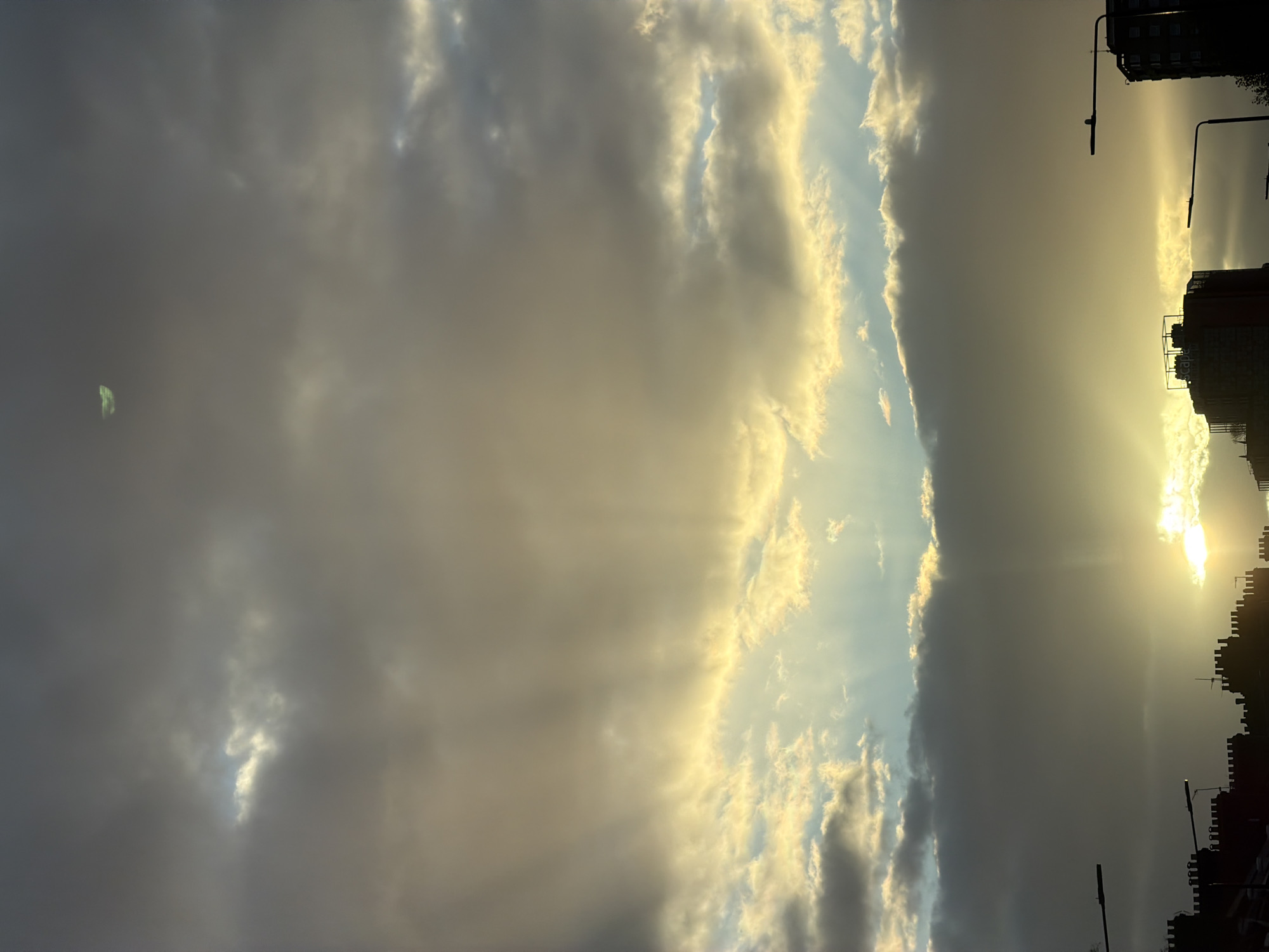low-angle view of the sky over an urban area, likely in London, United Kingdom. The sun is near the horizon, obscured by buildings and clouds, casting light rays downwards. Silhouettes of buildings and streetlights are visible against the bright sky. The clouds are a mix of dark, heavy formations and lighter, brighter ones, suggesting a dynamic weather condition.