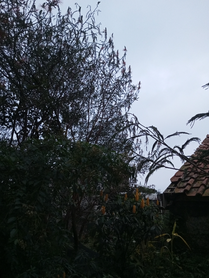 The image captures an exterior scene in Ciherang, Indonesia, under an overcast, light grey sky. The foreground and midground are densely populated with various botanical subjects. A tall tree on the left half displays dark, intricate foliage with numerous reddish, brush-like inflorescences pointing upwards. Below, a cluster of green shrubs features several plants bearing bright yellow, elongated, corn-cob-like flowers. To the right, a section of a building is visible, characterized by an aged terracotta-tiled roof. The roof exhibits multiple individual tiles, some appearing dislodged or absent, revealing underlying wooden structural elements. A dried plant stalk is present in the lower right foreground. No individuals or specific activities are depicted within the frame.