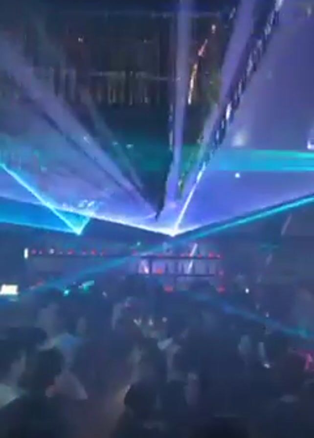 dense crowd of people at a nightclub. Above them, blue and white lasers illuminate the space. The lasers move and change color. The venue looks large, dark, and packed. The crowd appears to be enjoying the music and light show.