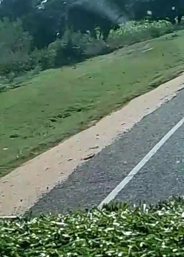 view from a moving vehicle, likely a car, traveling on an asphalt road with a solid white line marking the lanes. The road is bordered by a beige shoulder on one side. To the left of the road, there is a grassy slope leading up to a line of trees and vegetation at the top. The sky is visible in the background with some clouds. In the foreground, the top of a green hedge or shrub is visible at the bottom of the frame. As the video progresses, the view shifts slightly upwards, revealing more of the road and the vehicle's hood. There are power lines visible in the distance as well.