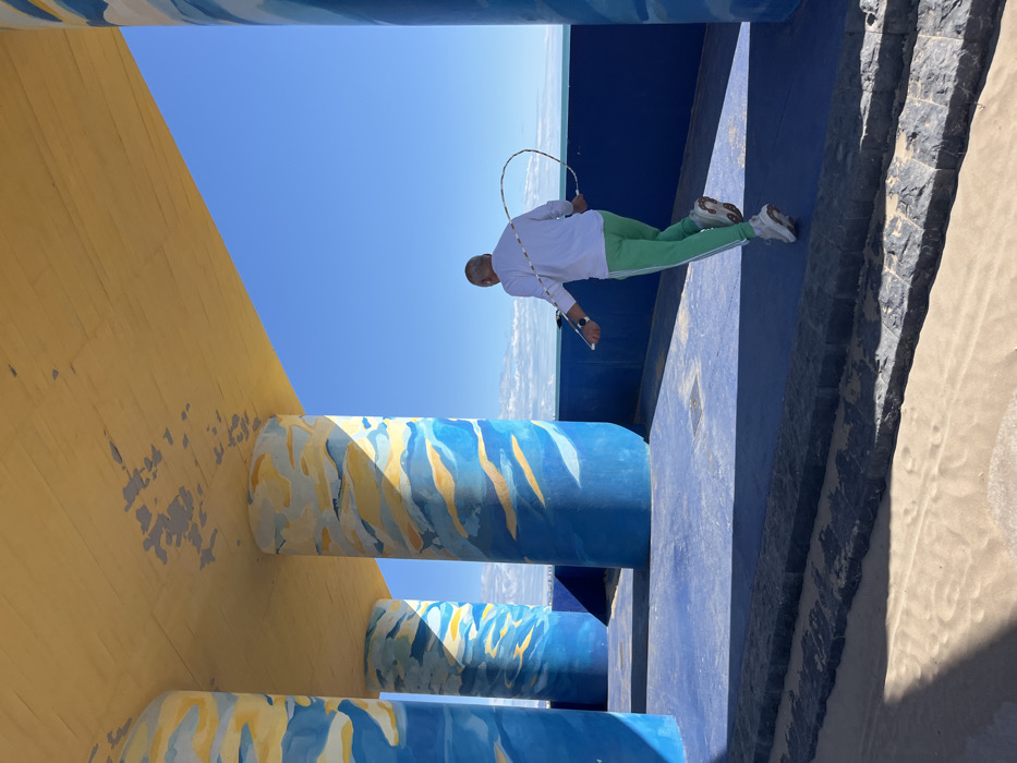man in a white shirt and green pants jumping rope on a concrete platform in Alboraia, Spain. The platform is shaded by a large, yellow, concrete structure with pillars. The pillars are painted with abstract blue and yellow designs. The platform is surrounded by a blue wall. There is sand on the ground below the platform. The sky is blue and the sun is shining. The man is facing away from the camera and is in mid-jump, with the rope trailing behind him. The scene is peaceful and serene.