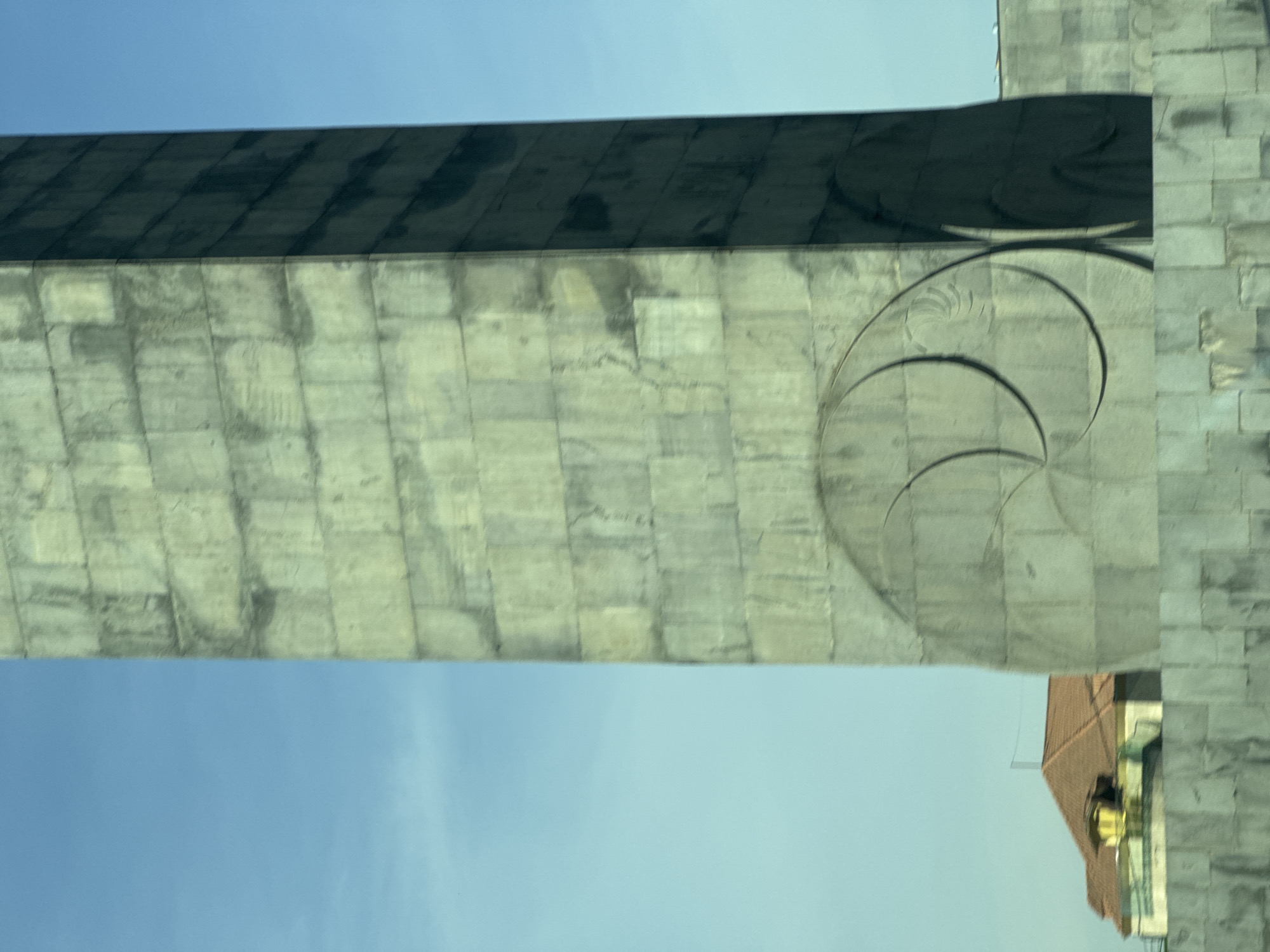 The image displays a colossal, rectangular stone monument, identifiable as part of the Armenian Genocide Memorial complex (Tsitsernakaberd) in Yerevan, Armenia. The structure is composed of large, light grey-green stone blocks exhibiting surface weathering and discoloration. Its lower visible facade features prominent, deep-relief abstract circular and curved carvings, which cast distinct shadows. The right side of the monument is in deep shadow, contrasting with the illuminated front. A clear, light blue sky dominates the upper background. To the lower left, behind the main monument, a building with a reddish-brown tiled roof and a distinct yellow-colored architectural feature on its roofline is partially visible. No people are present.