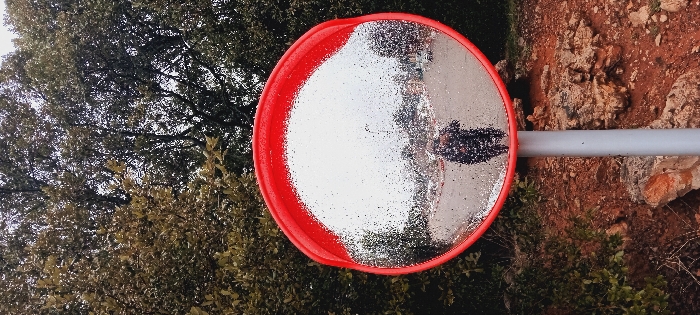 - "A large, circular convex safety mirror with a prominent red frame is centrally positioned, mounted on a light gray vertical pole" by FM-oKOCt2, licensed under CC BY 4.0