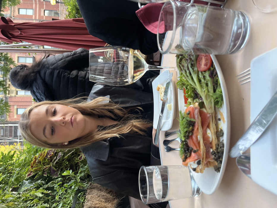 An outdoor dining scene in Boston, Massachusetts, is depicted. A young woman with straight blonde hair, wearing a black leather jacket, is seated at a light-colored table, looking downwards with a neutral expression. A pearl earring is visible on her left ear. On the table, a white oval plate holds a layered dish of smoked salmon, a creamy white substance, capers, and dill on pastry, accompanied by a green salad with a sliced tomato. A tall glass of water is positioned to her left, and a stemmed glass containing white wine is to her right. A small white dish with a partially consumed piece of bread and butter, along with silverware, is also on the table. A second water glass and a folded red napkin are visible on the far right. In the mid-ground, green foliage and red patio umbrellas are present, along with a person wearing a black puffer jacket, facing away from the camera. The background features multi-story brick buildings with numerous windows, characteristic of Boston's urban architecture.
