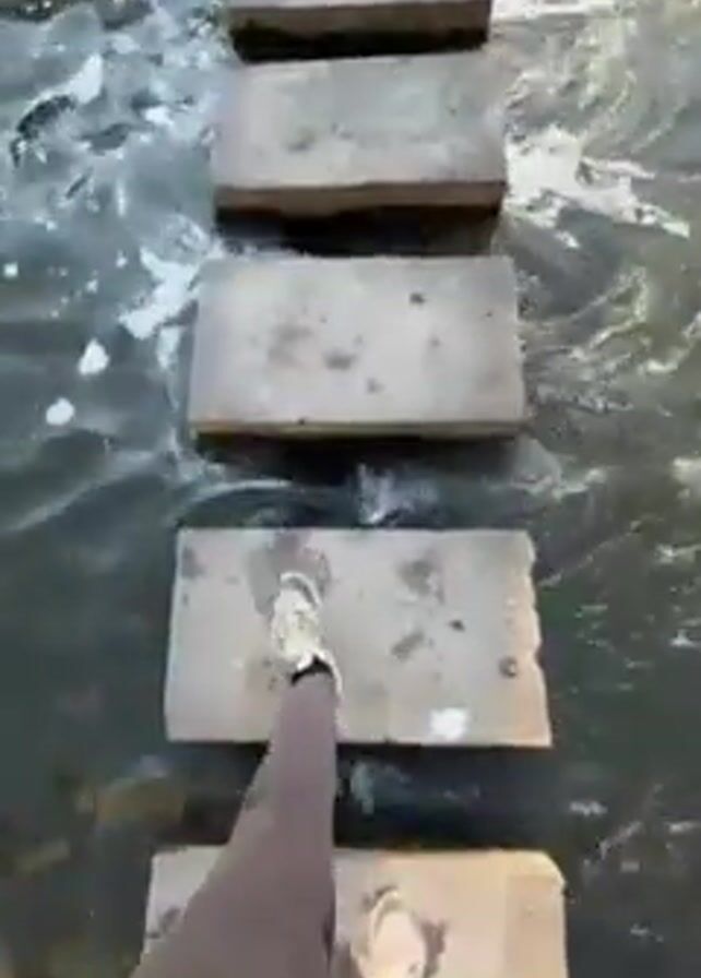 A person walks across a row of rectangular concrete blocks that form a pedestrian crossing over water. The water rushes around the blocks, with some white foam visible. The person is wearing sneakers, dark pants, and a blue jacket. The camera angle is first-person, looking down at the blocks and the walker's feet.