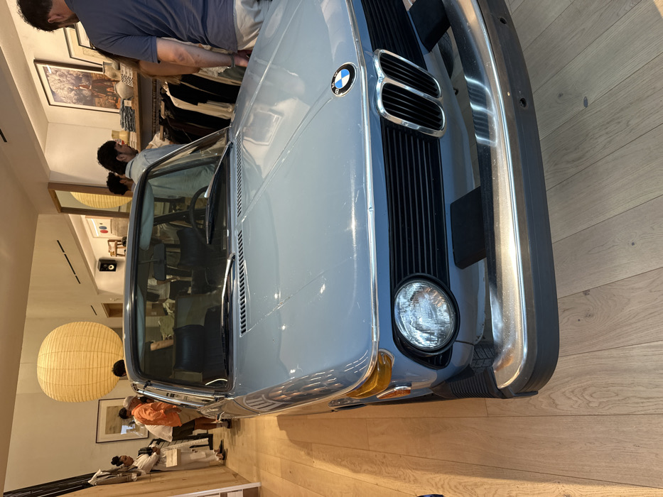 A light blue vintage BMW 2002 automobile is prominently displayed indoors, occupying the foreground of the image