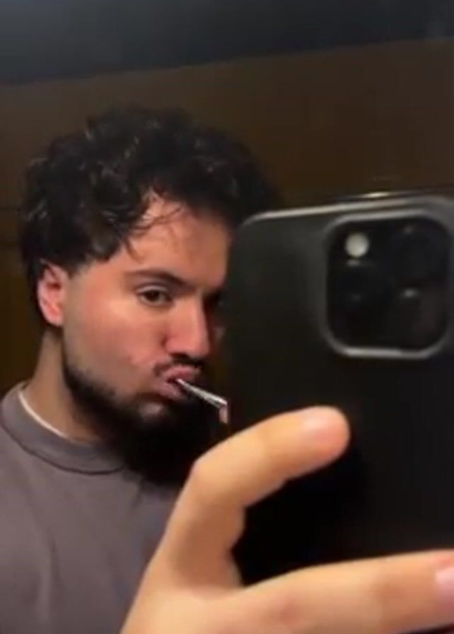 A young man is brushing his teeth while looking at his phone in a bathroom mirror. He is wearing a gray shirt and has dark curly hair and a beard. The phone is black and held in his right hand, obscuring part of his face. He is smiling slightly as he brushes. The background is blurred but appears to be a simple bathroom with light-colored walls. Musical audio plays in the background.