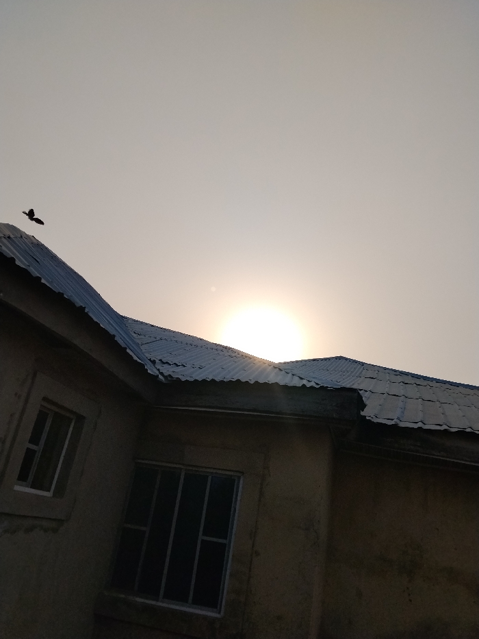 This image captures an outdoor scene in Abuja, Nigeria, featuring a building's roof and a portion of its facade against a light, hazy sky during either sunrise or sunset. The sun, a bright luminous circle, is partially visible above the corrugated metal roof, positioned in the lower right sky. The roof is composed of dark grey corrugated sheets, reflecting some sunlight. The building's walls are light brown with a textured, possibly stucco, finish. Two windows are visible on the facade; a smaller, higher window and a larger, lower window with multiple panes. Both windows have light-colored frames and dark, non-transparent panes. A dark, silhouetted bird with outstretched wings is captured in flight in the upper left quadrant of the sky, above the roofline. No people are visible.