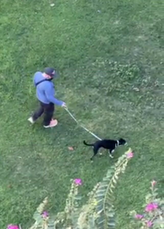A person wearing a blue long-sleeved shirt, black pants, pink shoes, and a baseball cap is walking a black and white dog on a leash across a grassy lawn. The view is from above, looking down at the person and dog. There are flowers and green foliage in the foreground.