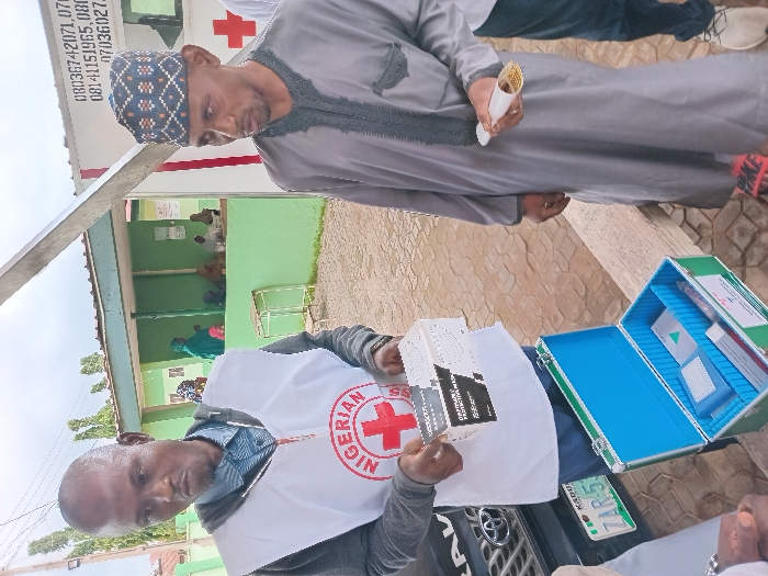 The image captures an outdoor scene at a public health or aid facility in Rigachikun, Kaduna State, Nigeria