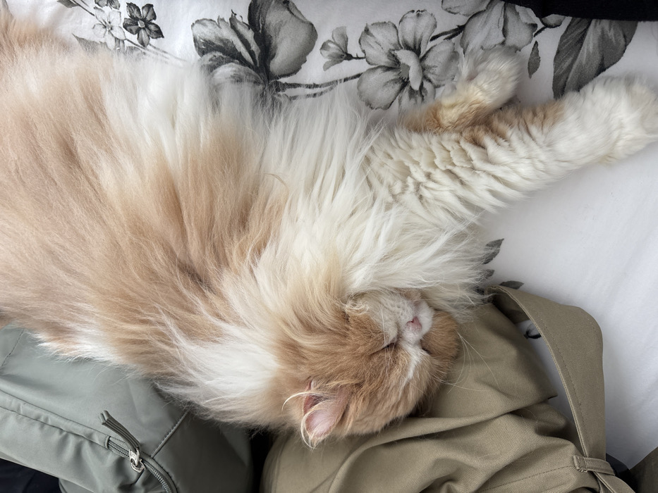 - "A long-haired domestic cat, exhibiting a coat of white and ginger-orange fur, is depicted sleeping on its left side" by FM-E1hwL2, licensed under CC BY 4.0