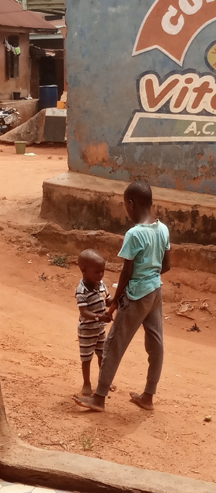 The scene is an outdoor, unpaved area in Umuoji, Nigeria, characterized by reddish-brown dirt. Two children of African descent are present. The child on the right, appearing older, wears a light blue short-sleeved shirt and grey pants, standing with their back mostly to the camera. This child is barefoot. The younger child on the left wears a horizontal striped short-sleeved shirt and matching shorts, facing the older child. This younger child is also barefoot and holds a small, light-colored object in its left hand, while its right hand appears to be in contact with the older child's left hand or wrist. In the background, to the left, is a building with reddish-brown walls and a reddish corrugated metal roof. A blue plastic barrel and various debris are visible near its base. To the right, a weathered light blue wall features partial white and orange signage. Visible text includes "Co" at the top, "Vita" in the middle, and "A,C," below "Vita." This wall rests on a concrete base. The ground features sparse vegetation in places.