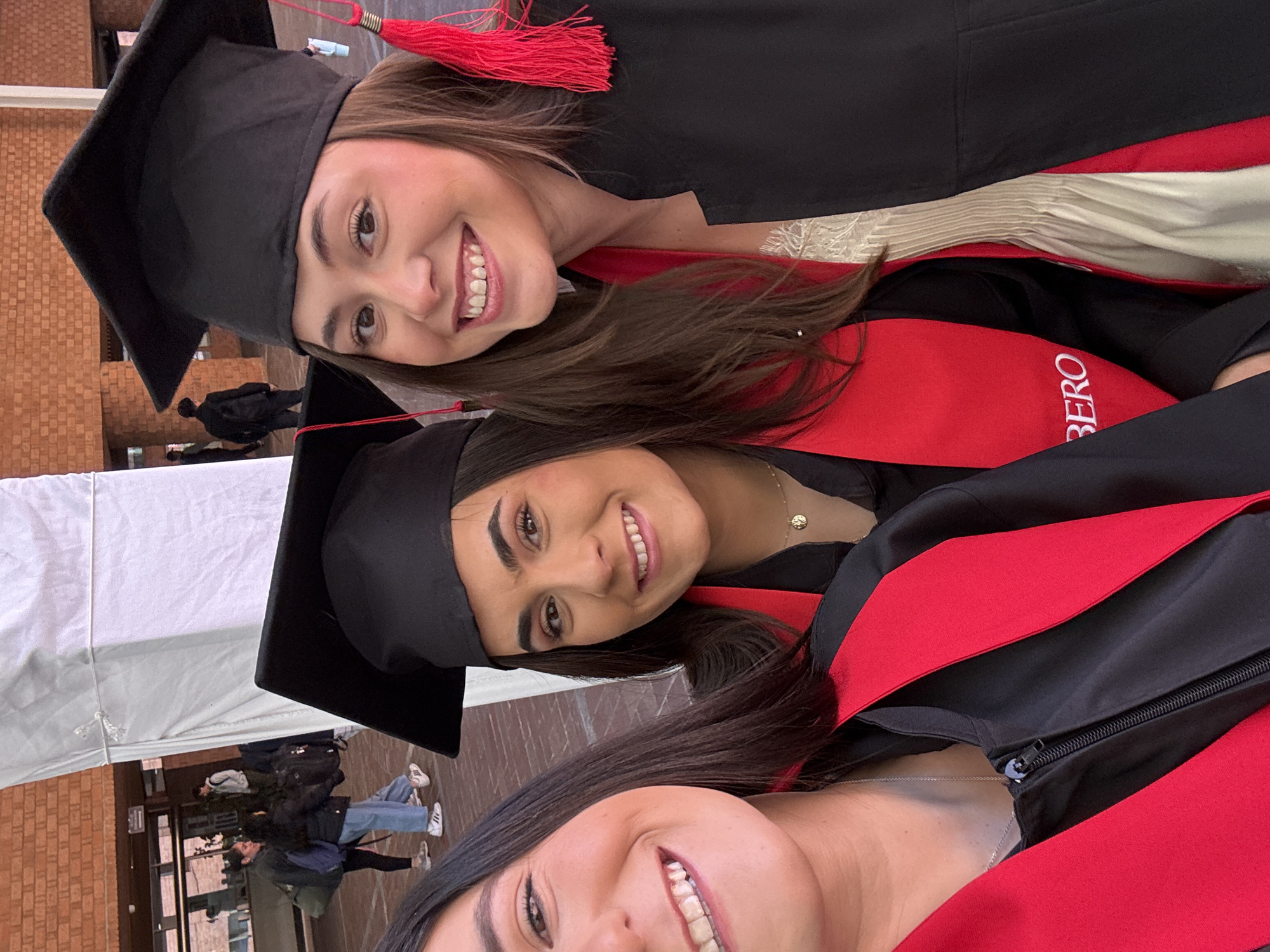 Three young adult females are depicted in a close-up selfie, smiling at the camera. All three wear black academic caps with red tassels and black graduation gowns with red stoles. White text reading 'BERO' is visible on the stoles of the middle and far-left subjects. The far-right individual wears a white garment beneath her gown, and her red tassel includes a gold-colored band near the cap. The background reveals an outdoor university campus environment with structures featuring red brickwork. Several other individuals are visible walking in the mid-ground. A large white fabric structure, possibly a temporary canopy or tent, is partially visible on the right side of the background. The scene indicates a celebratory event, likely a graduation. This event takes place at the Universidad Iberoamericana (IBERO) in Mexico City, Mexico.