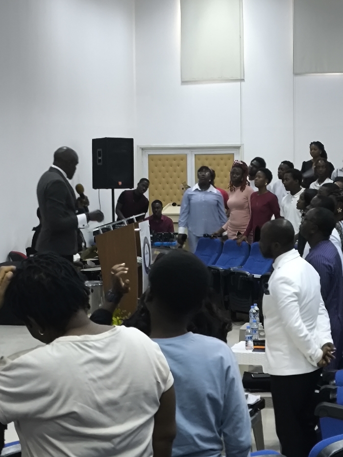 The image depicts an indoor gathering in Kızılbaş, Northern Cyprus / Cyprus, featuring approximately 20-30 individuals within a modern, brightly lit hall with white walls. In the mid-ground, a Black man in a dark suit, white shirt, and tie stands behind a wooden podium displaying a circular logo, holding a microphone in his right hand as if delivering a speech. A large black rectangular speaker on a stand is positioned to his right. To the right of the podium, a group of about ten individuals, predominantly Black and appearing to be young adults, stand facing forward/left, with several looking upward. This group includes a woman in a light blue button-up shirt and glasses, a woman in a peach-colored top, and a woman in a dark red top. Behind this standing group, several rows of unoccupied blue auditorium-style chairs are visible. In the right foreground, a Black man in a white blazer and dark trousers stands with his hands clasped behind his back, facing the direction of the podium. In the immediate foreground, two individuals are seen from behind: a person with dreadlocks in a light-colored top and another in a light blue long-sleeved shirt. A small white table holding three plastic water bottles is present in the lower right. The background features a textured tan-padded wall section, possibly a door, and other individuals, including a man in a dark red shirt near electronic equipment. The environment suggests a contemporary event space or auditorium.