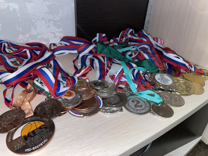 A heap of medals with red, white, and blue ribbons are scattered on a shelf. The medals are gold, silver, and bronze, some with inscriptions in Russian. A basketball medal with an orange basketball icon is prominent. Other ribbon colors include green and turquoise. The medals are piled haphazardly, suggesting they are awards or accomplishments from various competitions. The shelf is light-colored and appears to be part of a cabinet or storage unit.