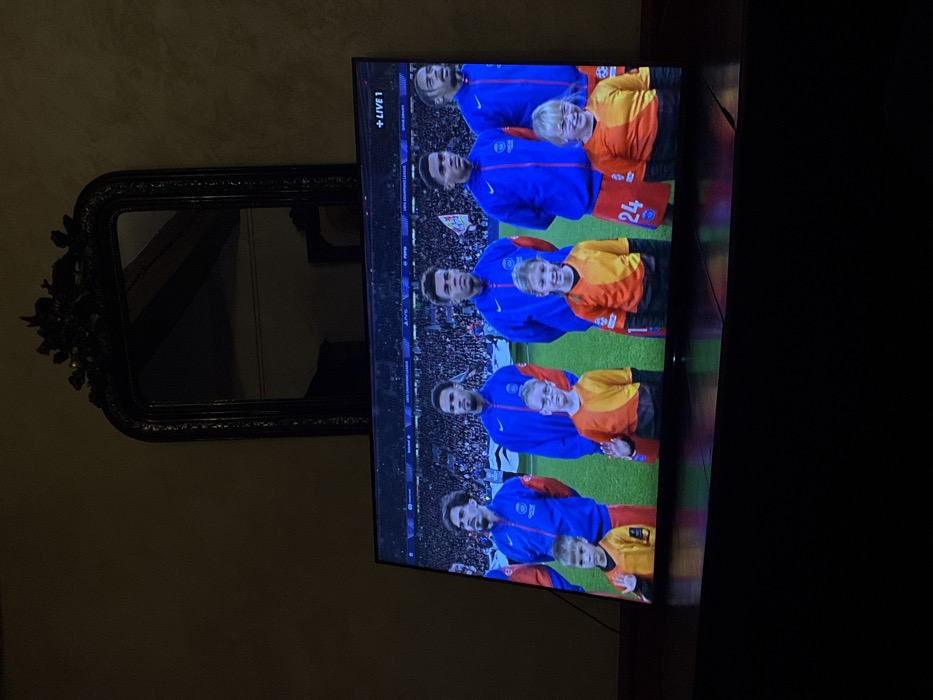 - "A large flat-screen television, positioned on a dark, reflective surface, displays a live soccer broadcast in a dimly lit room" by FM-41wDv1, licensed under CC BY 4.0
