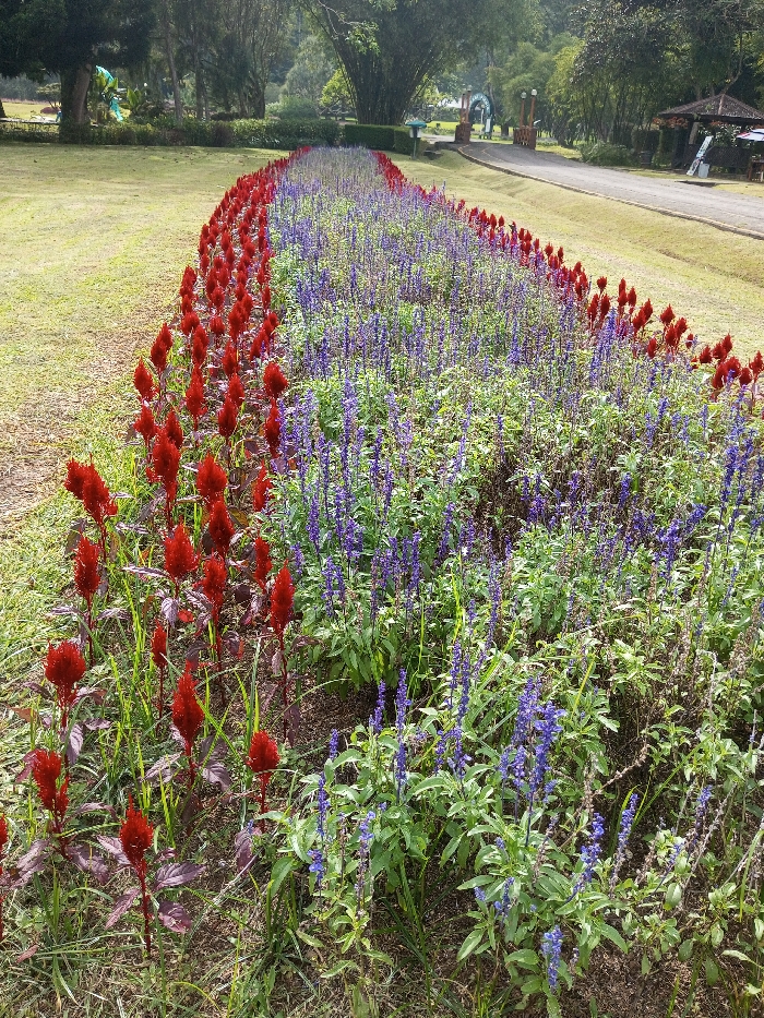 A vibrant flower bed stretches along a grassy lawn, bordered by a paved pathway. The left side features red Celosia flowers, while the right side showcases bluish-purple Salvia. The composition extends towards a blurred background with trees and a gazebo. The scene conveys a tranquil garden setting with a symmetrical color scheme.