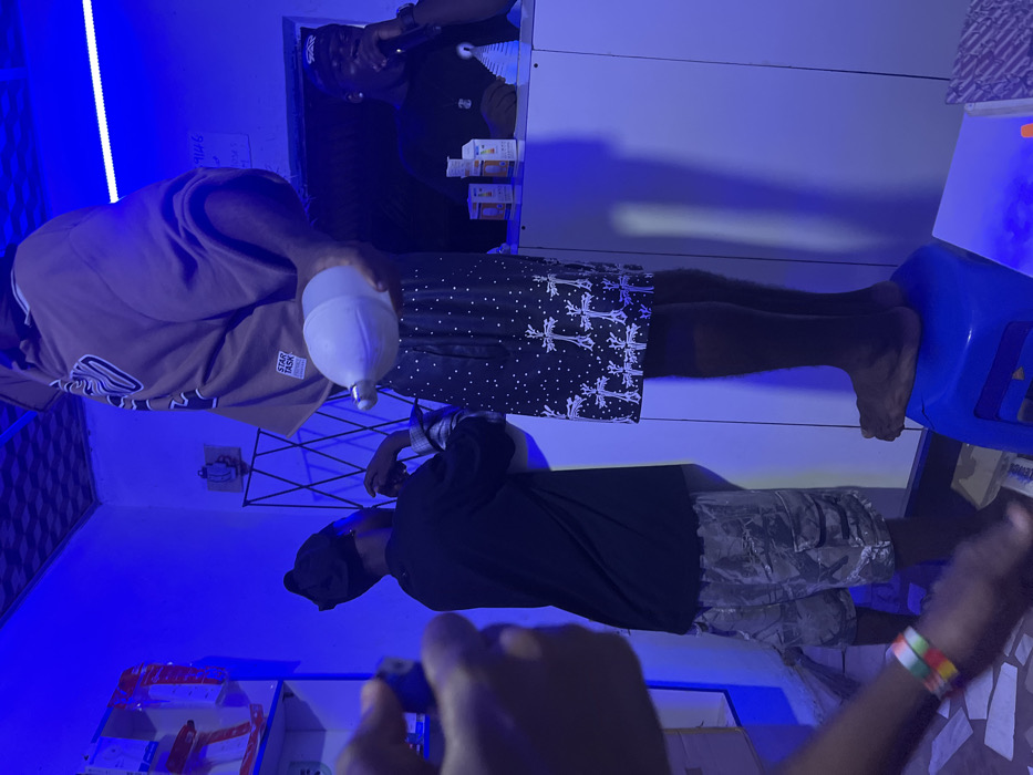 Inside a room bathed in blue light, three men are visible. One stands atop a blue plastic stool, wearing shorts patterned with white crosses and stars. He stands close to the countertop that has small juice boxes on it. Beside him, another man stands with shorts with camouflage patterns. In the foreground, a hand holds a small, black object. The overall setting appears casual, possibly a gathering of friends.