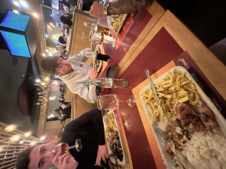 The image depicts a table setting at a restaurant with food and beverages. There are two individuals visible, one drinking from a wine glass and another pouring a drink. The table is covered in a maroon and light orange pattern. Dishes with fries, rice, and grilled meat are present. Drinks include wine, beer, and Coca-Cola. In the background, other patrons are dining, and there are two screens displaying a sports game. The restaurant is well-lit.