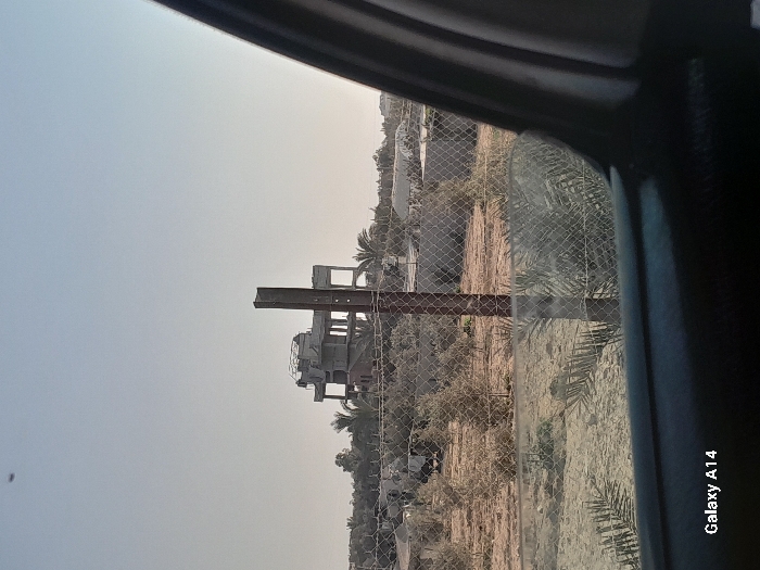 The image depicts an outdoor scene in the city of Deir el-Balah, Palestinian Territory, captured from inside a vehicle looking through a side window. The right side of the frame shows a dark gray interior vehicle pillar. The bottom of the frame is dominated by a dark gray/black vehicle window trim. In the immediate foreground, several blurred, dark green date palm fronds are visible, partially obscured by a faint reflection on the window. A chain-link fence spans horizontally across the mid-ground, slightly out of focus. A prominent dark brown/black vertical metal post, possibly an I-beam, stands centrally in front of the fence, featuring two visible pairs of circular fasteners. Beyond the fence, the ground is sandy and light brown, covered with sparse, dry, light-colored vegetation. In the background, a large, multi-story concrete structure, appearing either unfinished or partially demolished, dominates the left side of the frame. It exhibits multiple exposed levels, visible support columns, and an irregular top section with what appears to be exposed rebar. Further to the right in the background, scattered palm trees and low-lying, light-colored buildings with flat roofs are discernible. The sky, occupying the upper third of the image, is clear, pale blue, and hazy. A small, dark, indistinct object is visible in the upper-left portion of the sky. No human figures or active interactions are present. The white text "Galaxy A14" is overlaid in the bottom-left corner of the image.