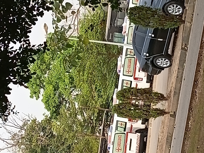 Ambulances parked alongside a road, with trees interspersed. A black car is also parked. The vehicles are situated beside a concrete barrier. Trees and greenery occupy a significant portion of the frame, with some extending into the upper left corner, obscuring the sky.