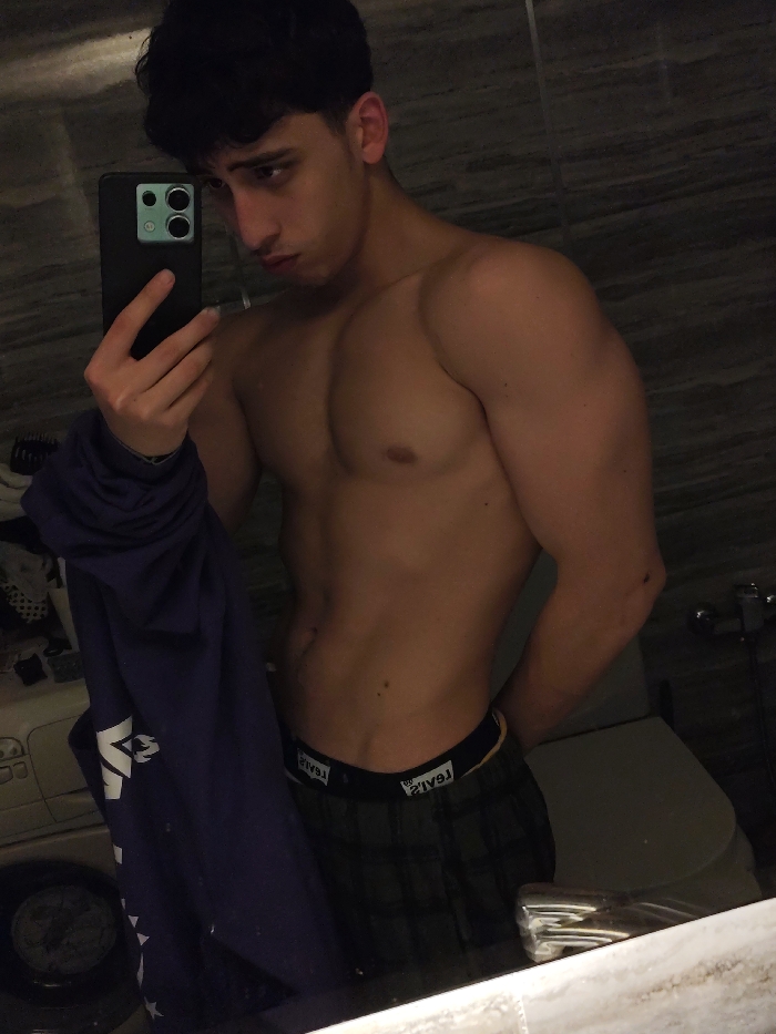 A shirtless young man takes a selfie in a dimly lit bathroom. He has dark hair, light skin, and visible muscle definition. He holds a phone with multiple camera lenses in his left hand, partially obscuring a blue shirt. His shorts are plaid with a dark waistband, and his underwear is visible. In the background, there is a toilet and a washing machine with laundry. The bathroom walls are tiled.