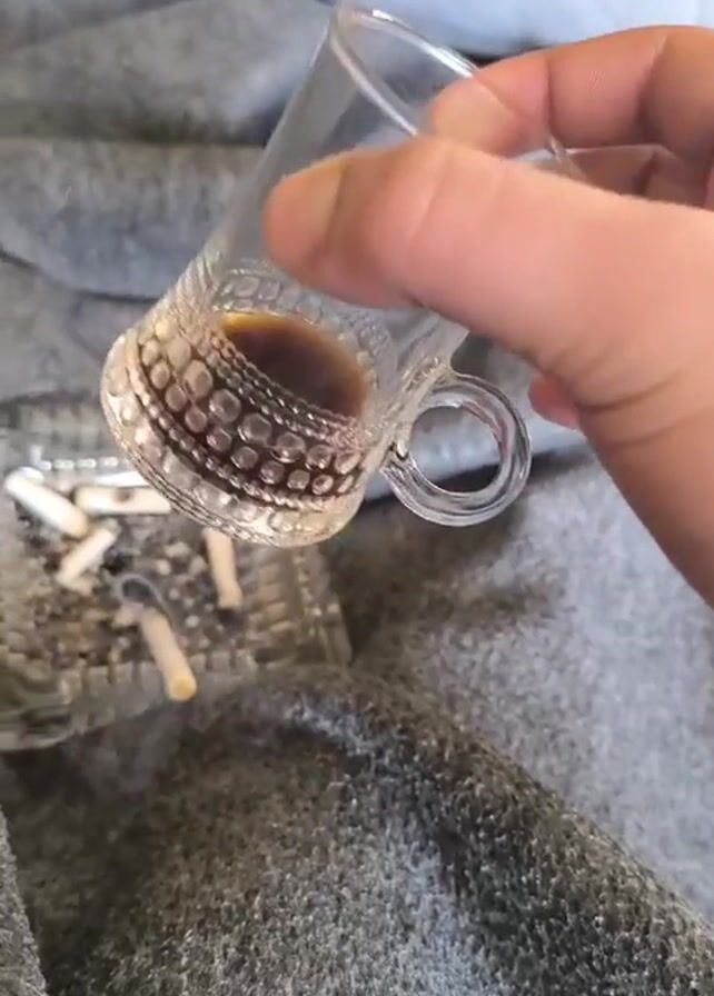 A hand holding a small clear coffee cup with ornate detailing is held in the air. The cup contains dark liquid. Below the cup on a grey blanket, there is a clear ashtray filled with cigarette butts and ashes. The blanket is rumpled and a white Adidas logo can be seen in the background. Smoke rises from the ashtray. The person says “Coffee and smoke”.