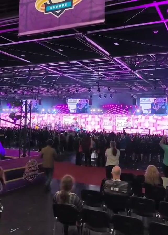 large room full of people attending a Pokémon International Championships event in Europe. A banner hangs overhead, displaying the event logo. The room is brightly lit with pink and white lights, and large screens on a stage display content related to the event. Many people are standing and watching the stage, while some are seated in chairs closer to the camera. A Unite Championship Series sign is visible on the left side of the frame. Some people are walking through the crowd.