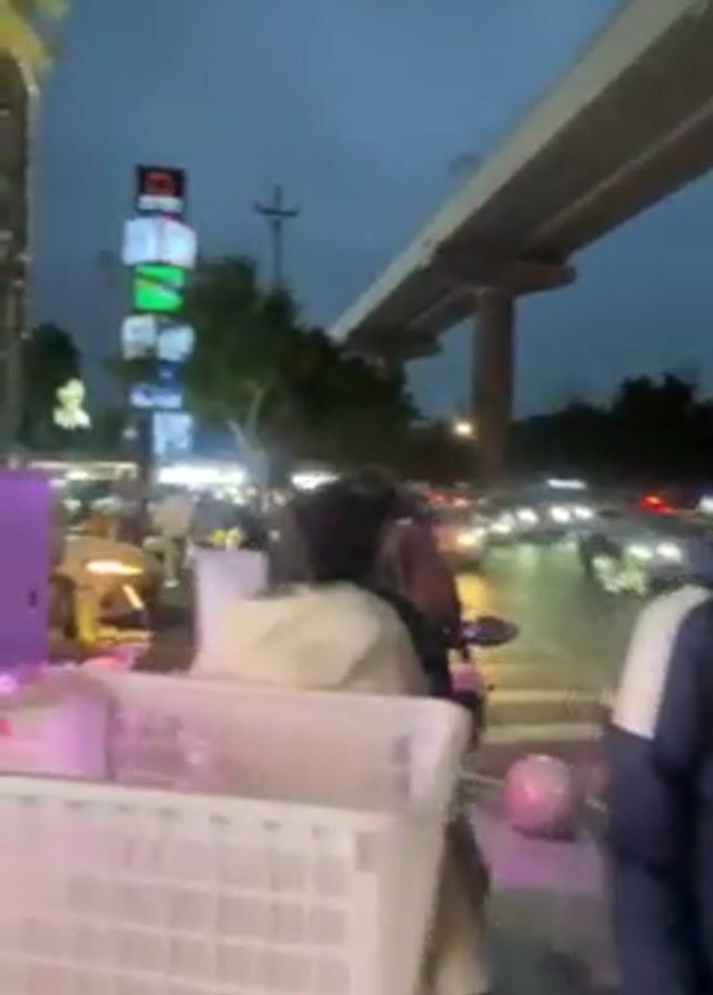 A street scene at dusk under a concrete bridge shows people walking past a vendor. A lighted tower of signs is to the left. Cars pass along the street. The vendor has a white plastic basket filled with items. Some people walk in the foreground.