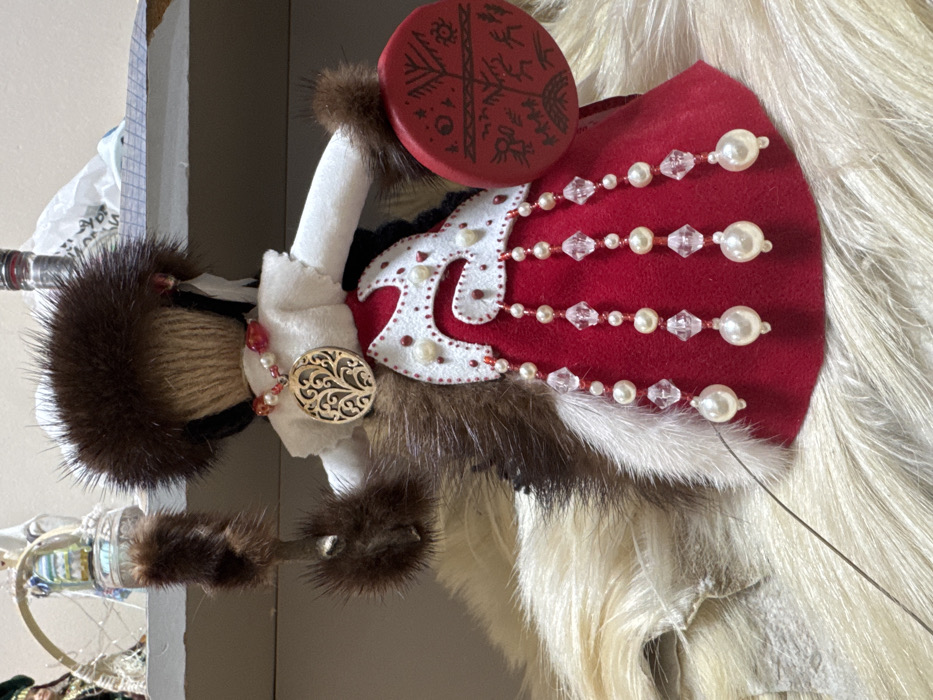 A handcrafted doll, indicative of cultural craftsmanship, is presented in a display setting within Perm, Russia. The doll features a head wrapped in light brown twine, topped with a dark brown fur hat, and is dressed in a white upper garment and a dark brown fur cape or vest, edged with lighter fur. A red felt skirt is accented with a white felt applique, stitched in red, adorned with small white pearls, and featuring five hanging strands of white pearls and clear faceted beads. A necklace of white pearls and red beads supports a round, gold-colored filigree pendant with a tree design. The doll holds a light-colored stick adorned with dark brown fur tufts in its left hand. In its right hand, it holds a circular, flat, red object resembling a shamanic drum or tambourine, decorated with dark brown stylized figures and celestial symbols. The doll is positioned on a surface covered with light-colored animal fur. The background reveals a blurred indoor environment with a light-colored shelf and indistinct objects.
