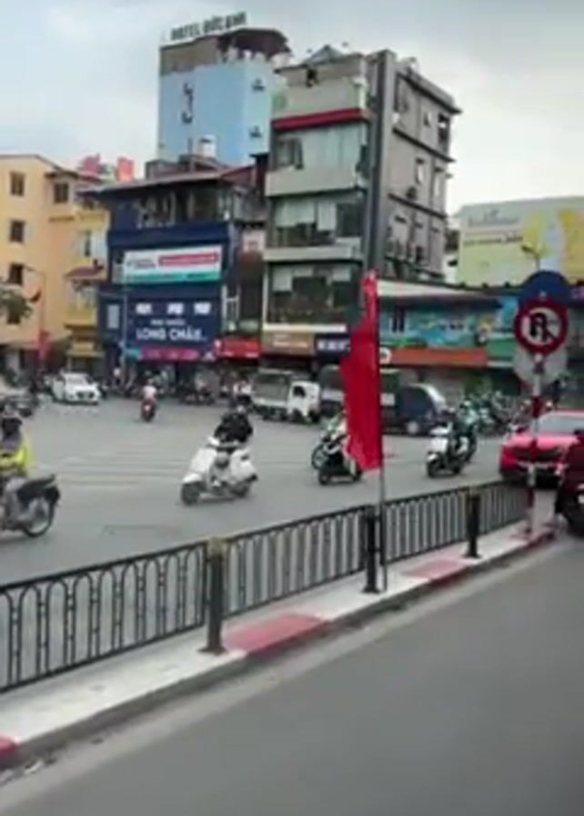 busy street intersection in what appears to be a city in Vietnam. Numerous scooters and motorcycles are driving through the intersection, many carrying one or two passengers. There are a few cars and trucks as well. The buildings around the intersection are a mix of colors and heights, with advertisements and signs visible. A "no U-turn" sign is also present. The sky is overcast. The camera is positioned on the side of the road, behind a metal fence.