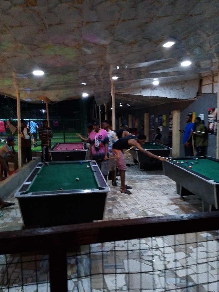 The image depicts an outdoor pool hall at night. Several people are playing pool on multiple tables, illuminated by overhead lights. The space is covered by a makeshift roof. In the background, some individuals are standing around, observing or waiting to play. A partial view of a railing or fence is in the foreground, adding depth to the scene.