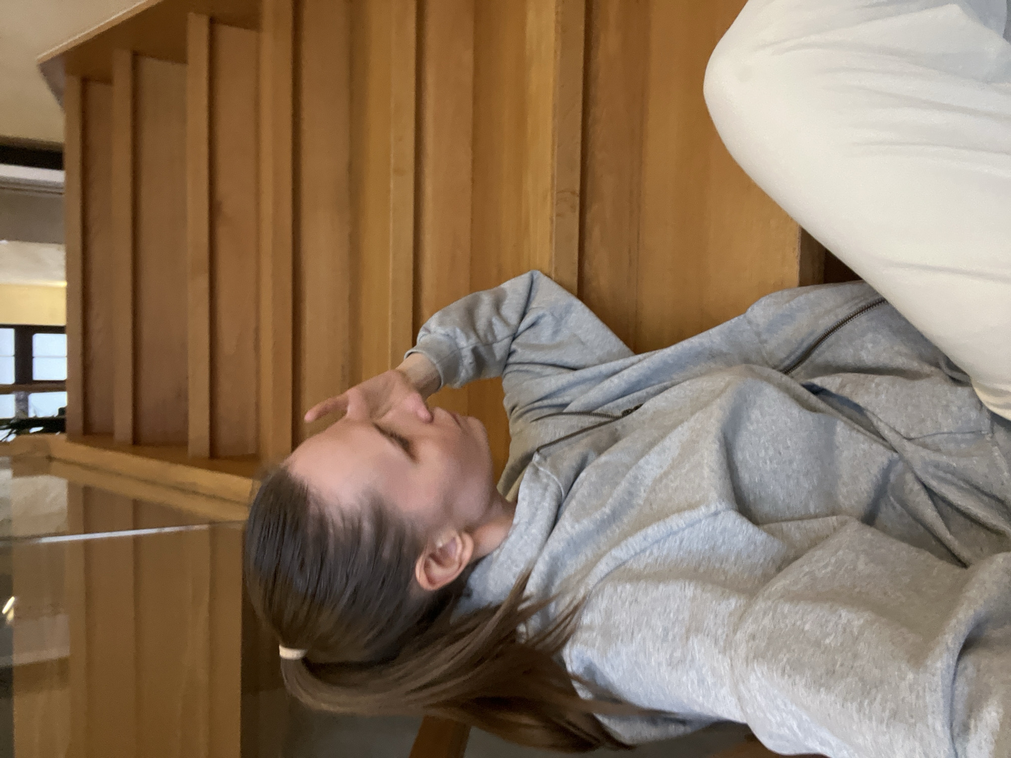 A female individual is depicted seated on a wooden staircase. She has light brown hair secured in a ponytail with a white elastic band. Her attire consists of a light grey zippered hooded sweatshirt and light-colored, likely white, pants. Her right hand is positioned against her right temple area, and her head is turned to the right with her gaze directed slightly downwards. To the left, a transparent panel, appearing to be glass, functions as a balustrade. The background reveals additional wooden steps and an indistinct interior space with a window or door frame visible. The specific location within the city of Gelendzhik, Russia, cannot be determined from the visual information provided.