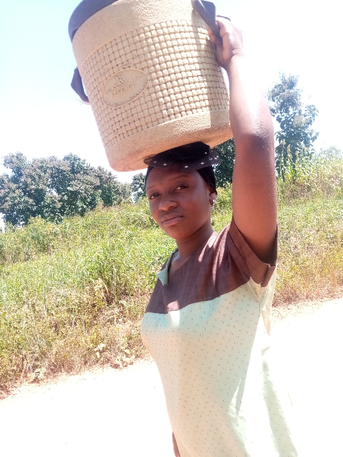 A young adult female is depicted outdoors on an unpaved path in Kaninkon, Nigeria, under a clear, bright blue sky