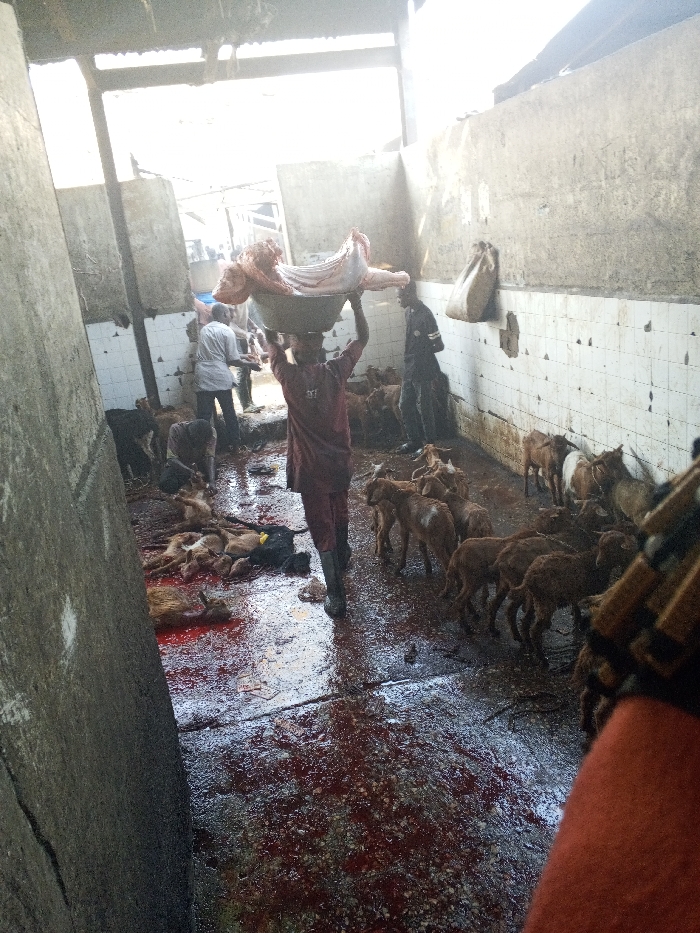 The image depicts an active abattoir or slaughter facility in Kofar Mazugal, Nigeria