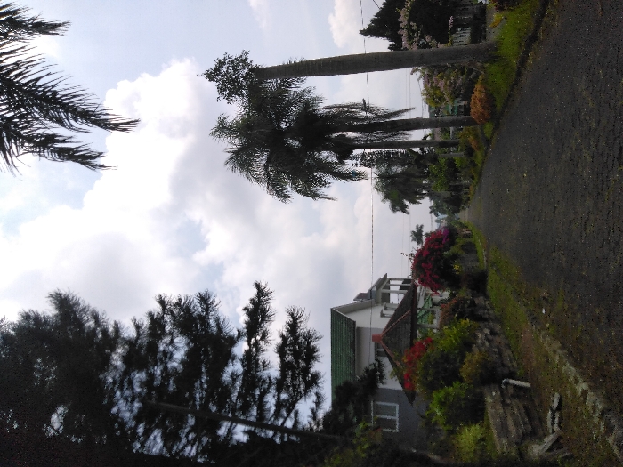 The image displays an outdoor residential scene in Emmerich on the Rhine, Germany, under a partly cloudy sky. A narrow, asphalted road, possibly a private drive, extends from the foreground into the distance, flanked by dense vegetation. On the left side, a multi-story house with a white facade and a dark green tiled roof is partially visible, featuring a rectangular window and a covered patio structure with a dark roof and white supports, enveloped by vibrant red and pink flowering bushes. A stone retaining wall with green moss and a white PVC pipe section supports the elevated terrain adjacent to the house. The upper left is dominated by a tall, dark coniferous tree. On the right side, several tall palm trees with dark fronds line the road, interspersed with various green shrubs and lighter-colored flowering plants. Utility lines are visible spanning horizontally across the upper-middle section of the frame. No individuals are present in the scene.